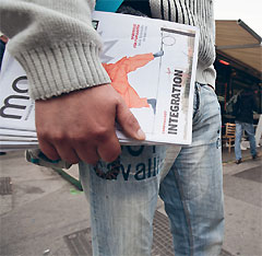 Das Lokal „Kantine“ im Wiener Museumsquartier ist zur Mittagszeit gerammelt voll. Ein Rom macht mit einer Straßenzeitung, die nicht mehr ganz taufrisch aussieht, die Runde. Er ist nicht erfolgreich: mitleidiges Kopfschütteln, ein Nein da, ein Nein dort oder schlichtes Ignorieren. Doch der junge Mann bleibt hartnäckig: Er hält die Hand hin und sagt „Einen Euro, bitte.“ Vergebens. Dann erzählt er mit traurigem Gesichtsausdruck von seinen Kindern, die zuhause in Rumänien nichts zu essen hätten. Ein Gast erbarmt sich und holt schließlich seufzend seine Geldtasche hervor. „Ich hätte wirklich gerne eine Handlungsanleitung, ob ich diesen Menschen Geld geben soll oder nicht. Man hört ja immer von Mafia und so“, sagt er. Der Naschmarkt, wo die Stände vor Obst und Gemüse nahezu überquellen, ist ebenfalls ein beliebtes Gebiet der KolporteurInnen von Straßenzeitungen wie Augustin und MO.