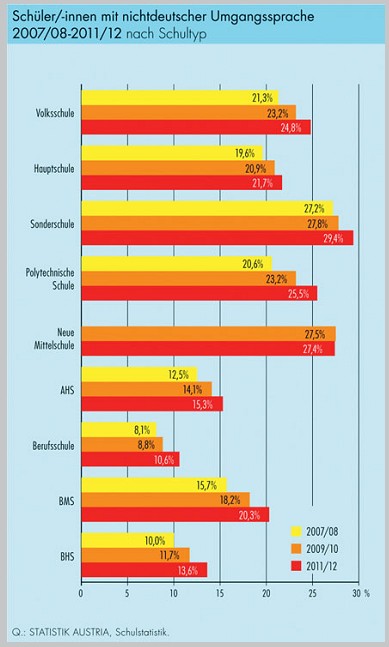 Schuljahr 2011/2012 bei nahezu 30 Prozent. In Allgemeinbildende Höhere Schulen schaffen es hingegen nur 15 Prozent der Kinder mit nichtdeutscher Umgangssprache. Ebenso von ausgeprägter Chancenungleichheit zeugt der Anteil der „Drop-outs“, also SchülerInnen, die nur ihre Pflichtschulzeit absolvieren und das System dann ohne Abschluss und damit ohne reale Chance auf einen Job verlassen. Bei Kindern mit nichtdeutscher Umgangssprache ist er mit 13 Prozent mehr als dreimal so hoch wie bei deutschsprachigen Kindern.